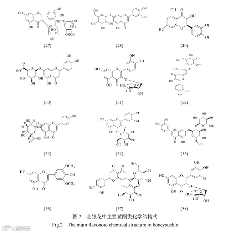 黄酮类物质具有较强的抗氧化活性,一般以C6-C3-C6为基本碳链骨架,常以苷类或碳糖基的形式存在,主要成分包括芦丁、木犀草苷、槲皮素等。不同品种金银花中的黄酮类成分不同,忍冬和山银花中主要黄酮成分为芦丁(含量分别为951、81 μg/g),红腺忍冬、灰毡毛忍冬和细毡毛忍冬主要黄酮成分为木犀草素-7-O-β-D-半乳糖苷(含量分别为106、116、165 μg/g)。金银花不同部位的黄酮类含量存在差异,其含量由高到低为叶(96.52 mg/g)>花(40.72 mg/g)>茎(14.26 mg/g)。金银花中类黄酮的含量从幼蕾期到金花期呈逐渐下降趋势,幼蕾期有最高值为13.29 mg/g。目前从金银花中鉴定出的黄酮类成分主要有芦丁(47)、木犀草苷(48)、槲皮素(49)、木犀草素-7-O-β-D-半乳糖苷(50)、槲皮素-3-O-β-D-葡萄糖苷(51)、木犀草素-7-O-β-D-吡喃葡萄糖苷(52)、芹菜素-7-O-葡萄糖醛酸苷(53)、金丝桃苷(54)、忍冬苷(55)、苜蓿苷(56)、苜蓿苷-7-O-新橙皮糖苷(57)、槲皮素-3-O-α-L-吡喃鼠李糖苷(58)等。金银花中主要的黄酮类成分及结构见图2。
