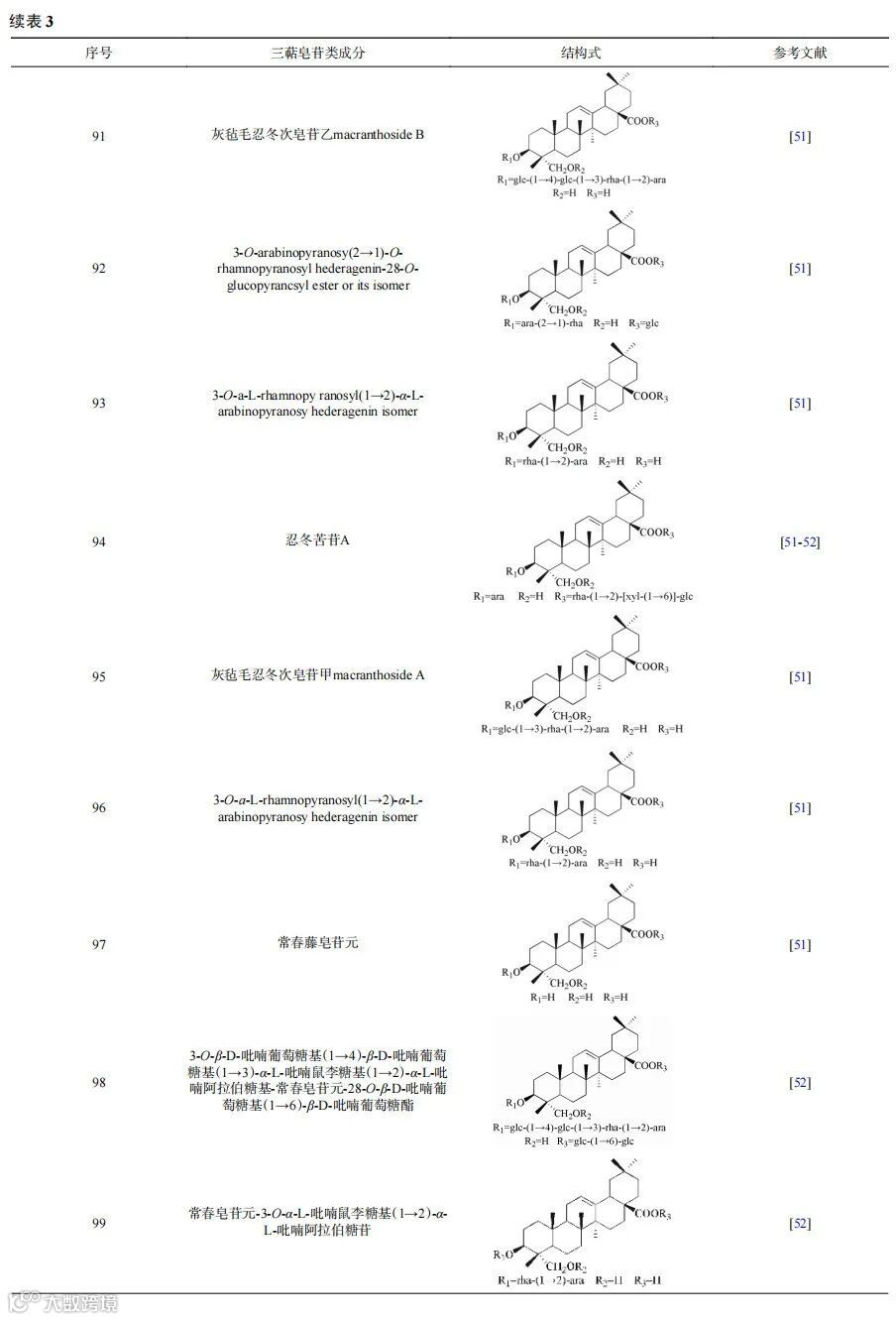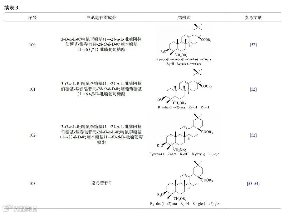 三萜和三萜皂苷类也是金银花中含量较多的功能性成分,具有良好的护肝功效和抗病毒作用,目前金银花中已发现的三萜皂苷类有30多种。李泮霖等从金银花中共确定了59种成分,其中包括灰毡毛忍冬皂苷甲/乙、灰毡毛忍冬次皂苷甲/乙、川续断皂苷乙、木通皂苷D、常春藤皂苷元等15种皂苷类成分。陈昌祥等从金银花花蕾中提取分离出了3-O-α-L-吡喃鼠李糖基(1→2)-α-L-吡喃阿拉伯糖基-常春皂苷-28-O-β-D-吡喃木糖基(1→6)-β-D-吡喃葡萄糖酯、3-O-α-L-吡喃鼠李糖基(1→2)-α-L-吡喃阿拉伯糖基-常春皂苷元-28-O-β-D-吡喃葡萄糖基(1→6)-β-D-吡喃葡萄糖酯等6个三萜皂苷类化合物。Li等首次从金银花中分离得到japonicaside C。Kwak等首次从金银花地上部分分离得到忍冬苦苷C。张小光等采用反相高效液相色谱法同时测定了金银花中忍冬苦苷A和忍冬苦苷C的含量,测得忍冬苦苷A和忍冬苦苷C的平均回收率分别为99.9%和98.3%。金银花中常见的三萜皂苷类成分及结构见表3。