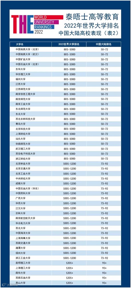 本轮排名中,广州大学、东华大学、青岛大学、浙江财经大学、成都大学、中国石油大学(华东)、上海科技大学、西南石油大学共8所高校为中国大陆地区首次上榜高校。其中表现最好的是广州大学(第601-800名),是今年中国大陆排名最高的新上榜高校。