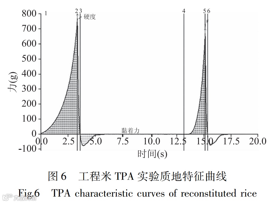 如图6所示,工程米的硬度为第一次压缩时的最大峰值,即第一个峰值对应的力(2);弹性是指样品经过第一次压缩以后能够再恢复的程度,用垂线4与5之间与1与2之间的时间比值(Time4 -5/Time1-2)来表示;内聚性指垂线4与6之间曲线与1与3之间曲线分别与横坐标所围的面积比值( Area4 - 6/Area1-3);黏着性是指垂线3与4之间曲线与横坐标所围的面积(Area3-4,g·s)。
