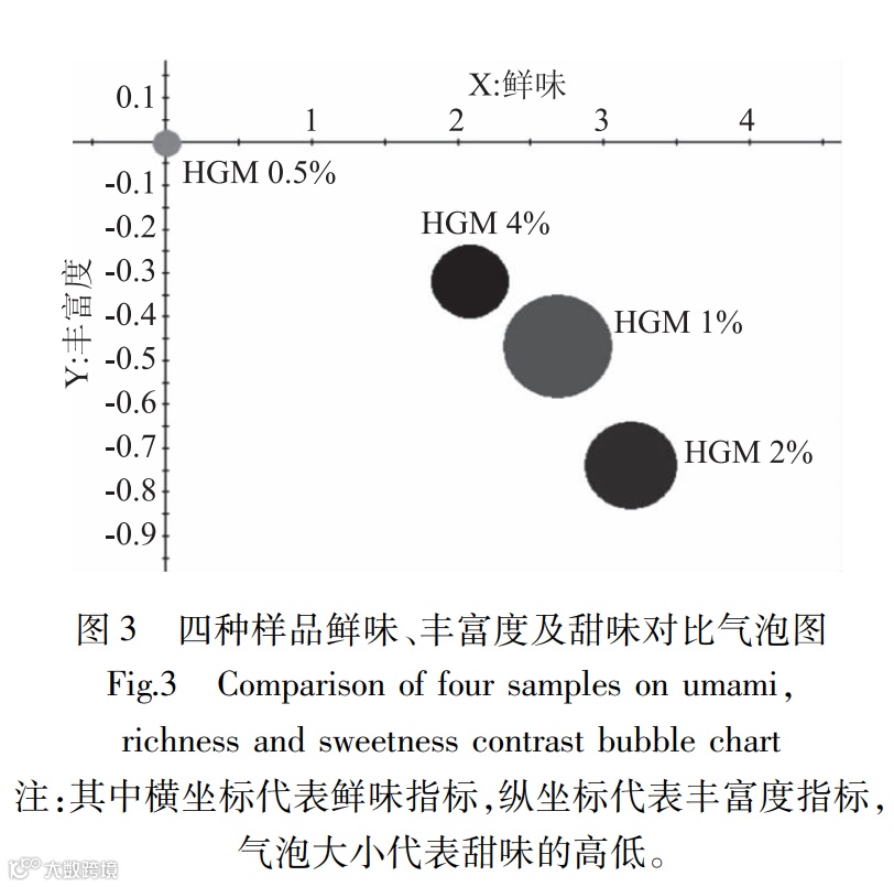 图3是四种样品的鲜味、丰富度及甜味的气泡图,HGM 0.5%样品的甜味﹑鲜味指标较低,HGM 1%的甜味指标最高,鲜味及丰富度介于HGM 2%和HGM 4%两样品之间,且与HGM 2%的鲜味指标相差不大。甜度、鲜味及丰富度指标均随红曲米粉添加量的增加呈先增后减的趋势,甜度在HGM 1%添加量时最高,鲜味及丰富度在HGM 2%时最高,可能与产品中呈苦、呈酸物质的增加及综合作用有关。