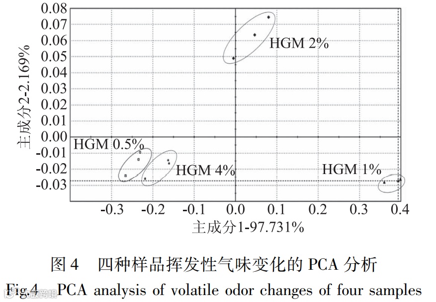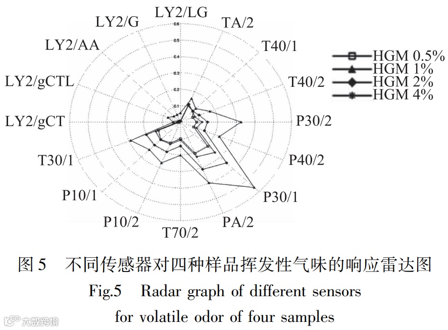 由图5结合表1可知,不同传感器对四种样品挥发性气味的响应值不同。红曲米中丰富的蛋白质、碳水化合物等活性成分挥发后,主要引起T、P型传感器产生高响应,LY2系列传感器的响应值均偏低,此结果与其他文献利用电子鼻测定大米挥发性成分的结果相似。LY2系列传感器主要对胺类等有毒性气味敏感,而T、P型传感器主要对食物的香气以及芳香族化合物敏感。图5中HGM 1%的各项良性风味指标均较强,其次是HGM 2%,而HGM 0.5%及 HGM 4%的各项响应值相差不大,均不是很强。