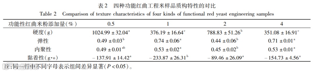柔软香甜的大米,口感受多数人欢迎,工程米的硬度与口感适宜性成反比。弹性表示样品经过第一次下压之后,能够再恢复的程度,弹性指标反应米饭的咀嚼口感,弹性相对较高,食用过程中的口感越好,由表2可知,红曲米粉添加量为1%和4%的工程米在硬度方面没有显著性差异,均高于添加量为0.5%和2%的工程米,口感相对较好;内聚性表示产品内部组织结构的紧实性,四种添加量的红曲工程米样品在内聚性方面差别不大;黏着性是指咀嚼米饭时,食物对上颚、牙齿、舌头等接触面黏着的性质,是产品糯性的一个表征,与产品吸水率有关,红曲米粉添加量为1%的工程米在黏着性方面与其他3种样品存在显著性差异,因此1%添加量的产品糯性更强。推测是由于功能性红曲米粉是由熟化发酵后的大米制得,处理过程中会产生抗性淀粉,利用功能性红曲米粉制备工程米,其产品硬度会升高,同时产品微隙增多,导致产品吸水率增加,糯性增强,而产品质构特性是多方面综合作用的结果。工程米最终质构特性与产品中纤维类物质、蛋白类、胶质类等的含量和综合作用有关,纤维含量越高,产品吸水率越高,硬度和黏着性会略有增加;蛋白类、胶质糖类物质含量越高,产品的弹性越好。因此功能性红曲米粉添加量为1%的工程米的口感特性,整体指标方面与4%添加量的样品相近,但与其他两种样品具有显著性差异,更加软糯,且弹性较好,食用过程中具有一定的咀嚼口感。