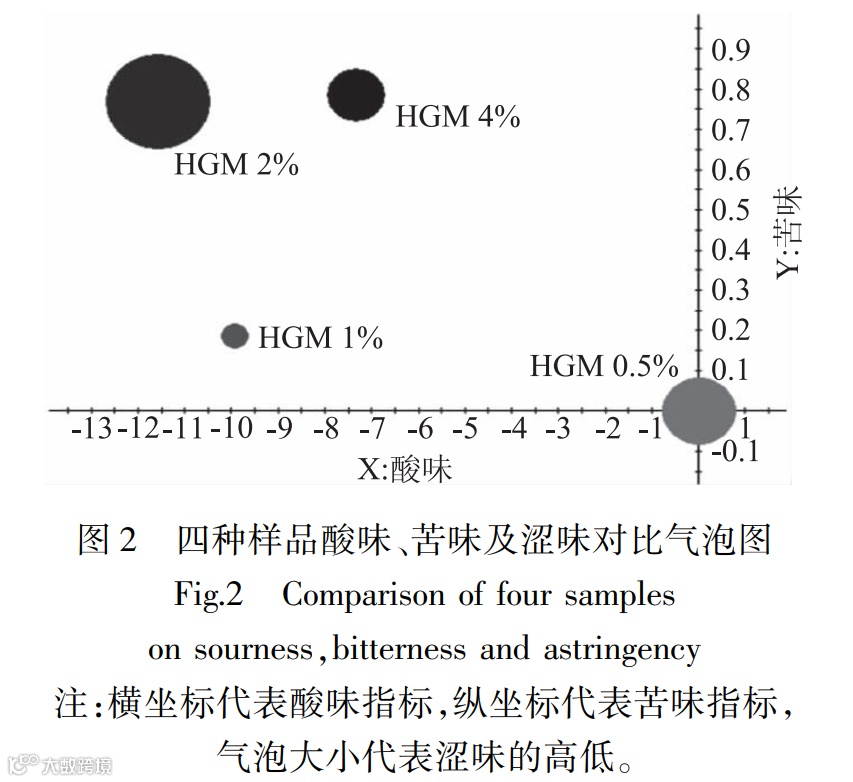 图2是四种样品的酸味、苦味、涩味的气泡图,HGM 0.5%样品的涩味指标较高,HGM 2%和HGM 4%两种样品的苦涩味指标明显偏高,而HGM 1%的苦涩味指标较低,且酸味指标介于HGM 2%和HGM 4%两样品之间。不同味觉指标之间同样存在协同和拮抗的作用,随着红曲米粉添加量的增加,苦味指标有增强的趋势,但 HGM 2%和4%添加量的产品苦味程度相近,酸味指标随添加量的增加呈现先增后减的趋势,可能与产品中其他呈甜、呈酸的成分相互影响的综合结果。