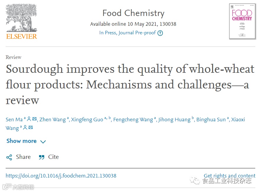 2021年5月10日,食品领域TOP杂志 Food Chemistry (IF = 6.306) 在线发表了河南工业大学粮油食品学院杂粮加工理论与技术团队的综述论文“Sourdough improves the quality of whole-wheat flour products: Mechanisms and challenges—a review”。马森副教授、王晓曦教授为本文通讯作者。文章作者还包括2019级硕士研究生汪桢、郭兴凤教授、王凤成教授、黄继红教授级高工和孙冰华博士。该综述以酸面团发酵技术为切入点,综述了酸面团发酵技术用于提升全麦制品的机理和挑战。