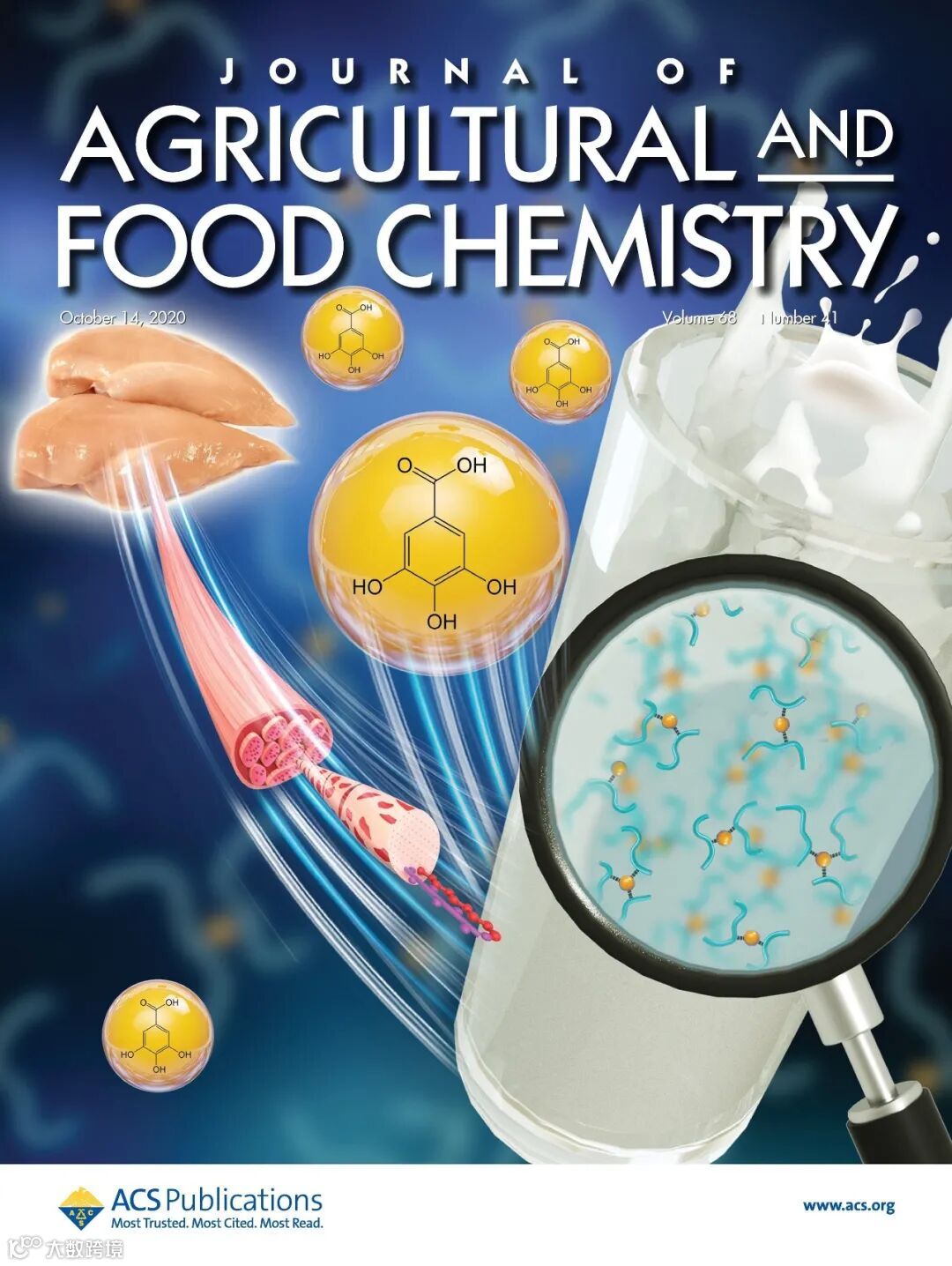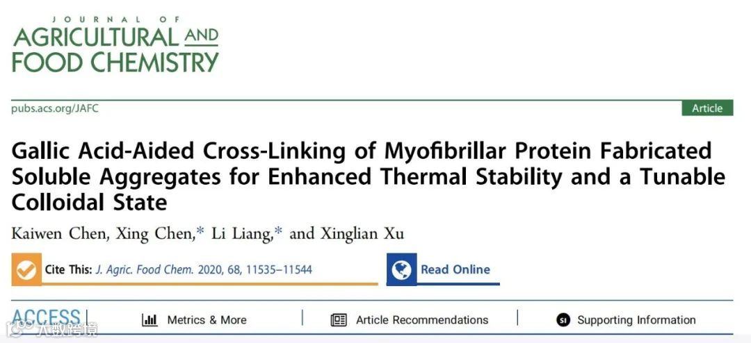 2020年10月14日,江南大学国重食品蛋白与营养团队在农林科学SCI一区国际Top期刊《Journal of Agricultural and Food Chemistry》最新一期 (2020, Volume 68, Issue 41, pp11535-11544)发表题为《Gallic Acid-Aided Cross-Linking of Myofibrillar Protein Fabricated Soluble Aggregates for Enhanced Thermal Stability and a Tunable Colloidal State》(DOI: 10.1021/acs.jafc.0c02059)的封面论文。该论文第一作者为江南大学食品学院2018届硕士研究生陈楷文,通讯作者为江南大学国重食品蛋白与营养团队陈星副研究员和梁丽教授(点击左下角阅读原文,直达文献页面)。