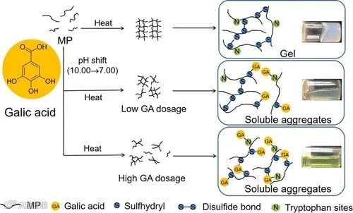 没食子酸(Galic acid,GA)作为一种天然多酚具有良好的水溶性和抗氧化性。蛋白质和多酚之间的相互作用可以以非共价和共价的方式进行。在特定条件下,如碱性环境,没食子酸能够氧化形成醌式结构,共价结合到蛋白质的亲核位点(如巯基)上,从而屏蔽巯基并抑制二硫键的产生以提高MP的热稳定性和抗氧化性。另外,GA具有较小的尺寸和有限的活性位点,不会造成蛋白质的过度聚集或交联。