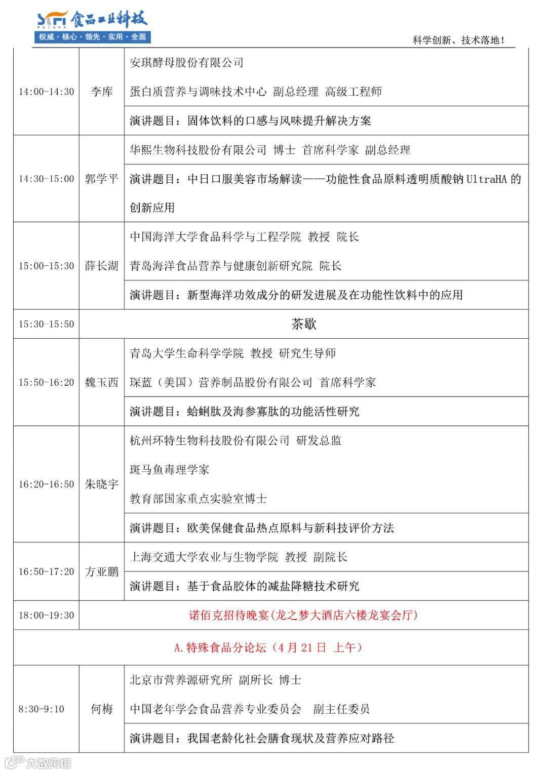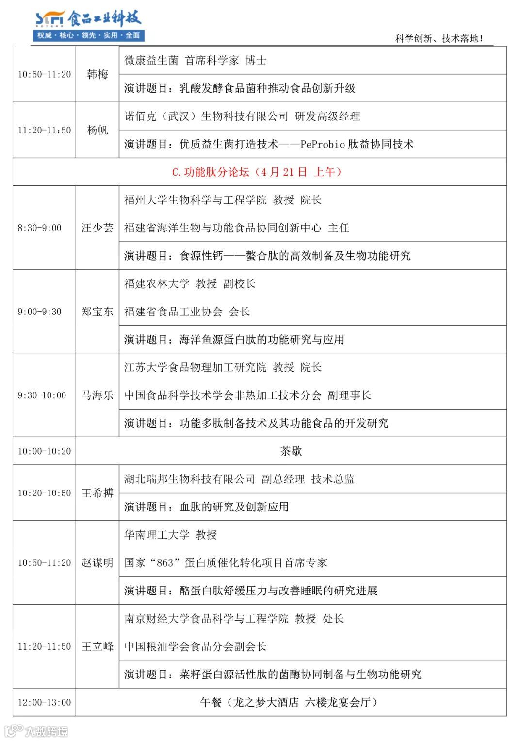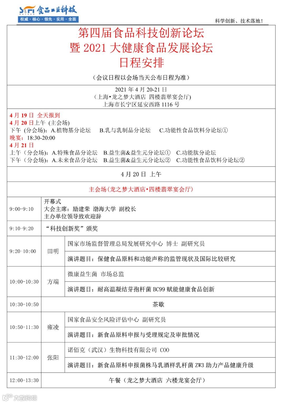 听众构成:60%-70%为食品企业的研发与管理人员、10%-15%为高校、科研机构的教授、专家,是一个名副其实的科学创新、技术落地的论坛。
