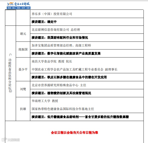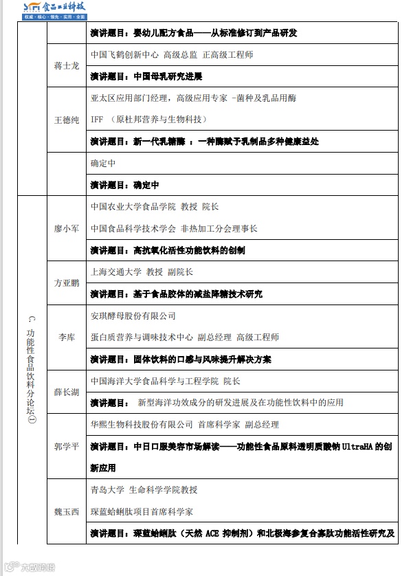 本着“科学创新,技术落地”的宗旨,食品科技创新论坛结合市场需求和趋势,特设置“功能性饮料分论坛”,邀请行业权威专家、知名企业进行现场的技术交流,已经确定参加此分论坛的嘉宾如下(排名不分先后):