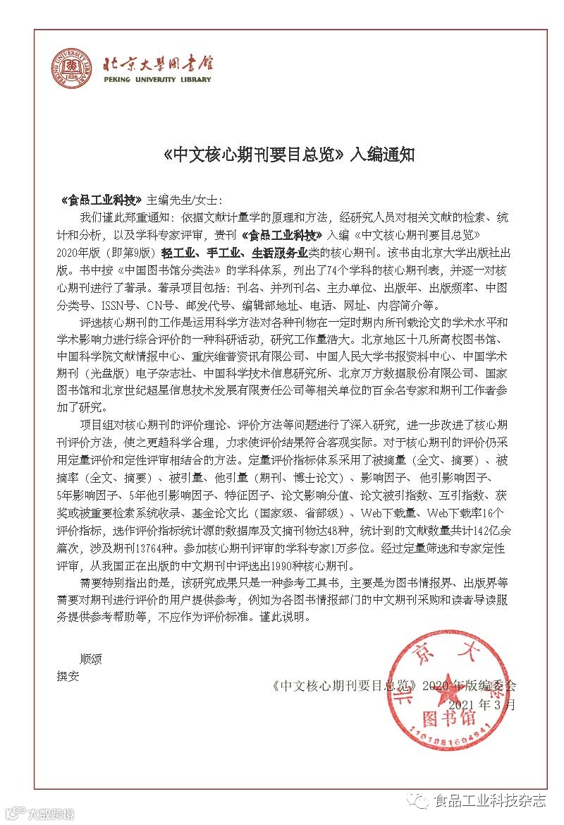 近日,北京大学图书馆《中文核心期刊要目总览》编委会发来通知,《食品工业科技》入编《中文核心期刊要目总览》2020年版(即第9版)轻工业、手工业、生活服务业类的核心期刊。本刊继续被收入《中文核心期刊要目总览》,是对本刊学术水平和期刊质量的充分认可,更是对本刊编委、审稿专家和全体工作人员辛勤耕耘的充分肯定。
