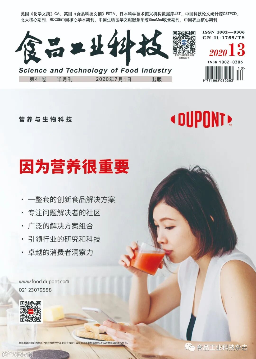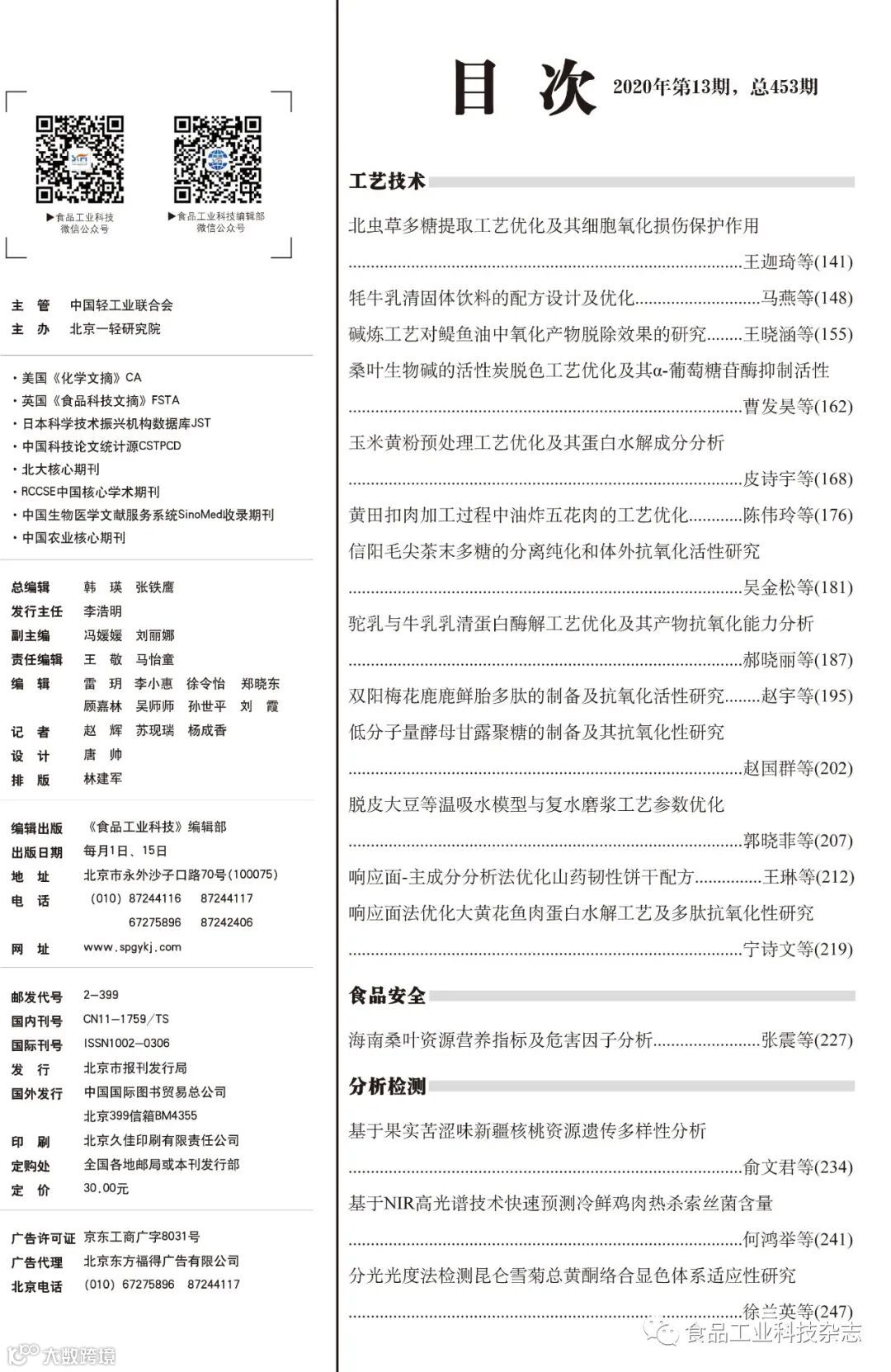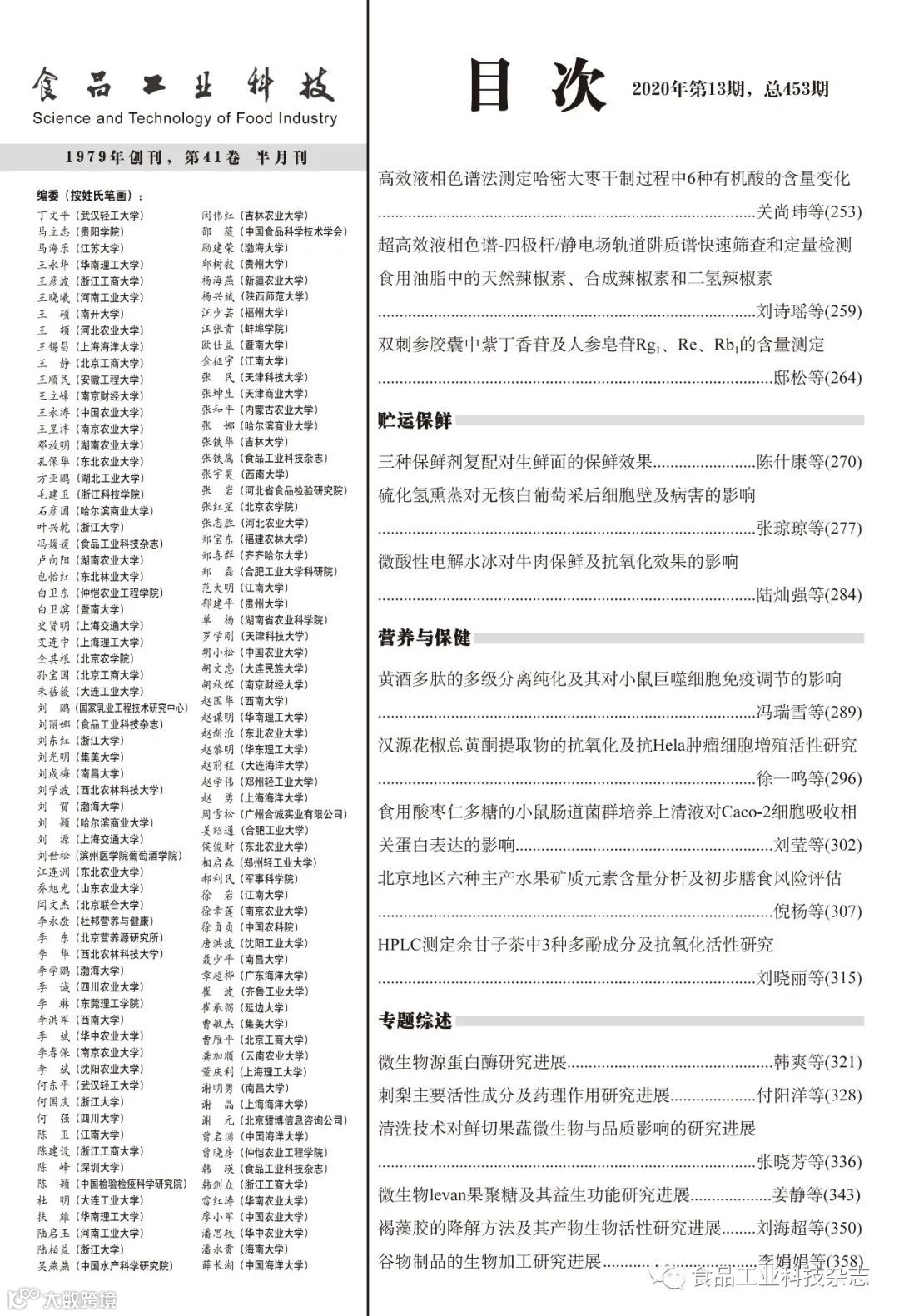 2020年41卷第13期封面及目次 食品工业科技编辑部