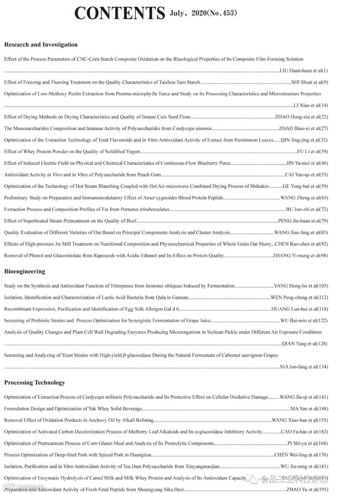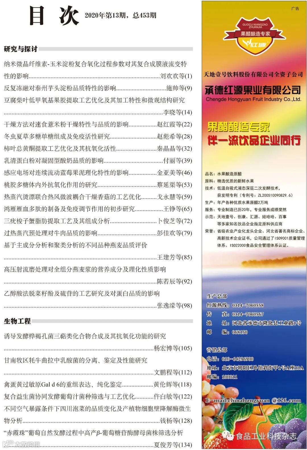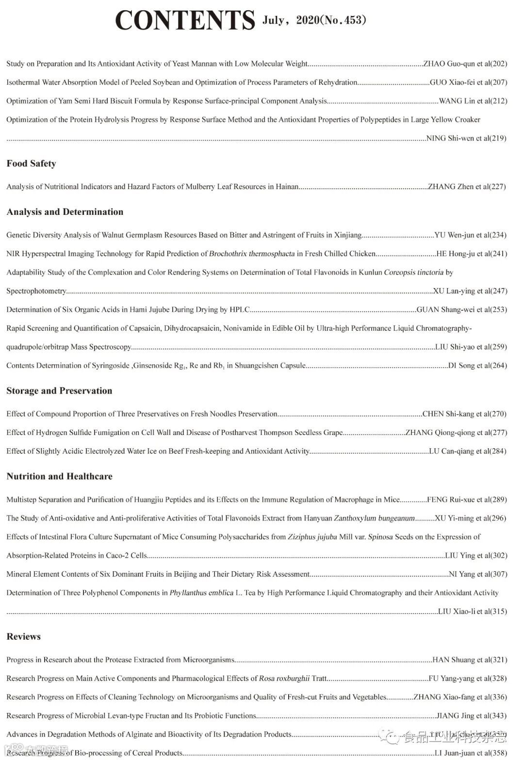 2020年41卷第13期封面及目次 食品工业科技编辑部