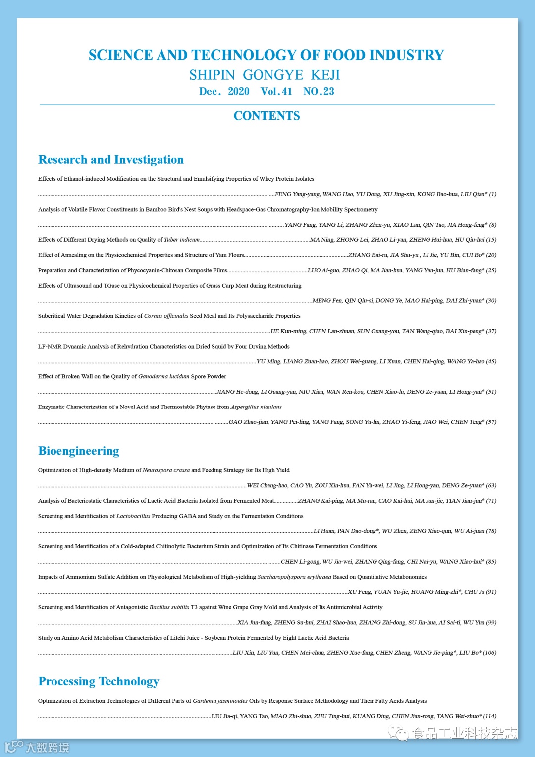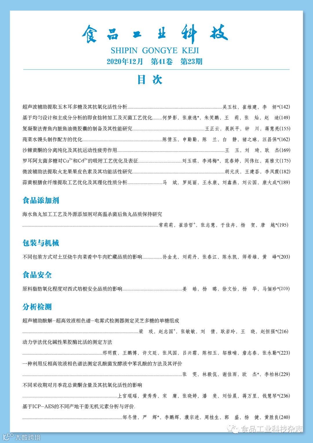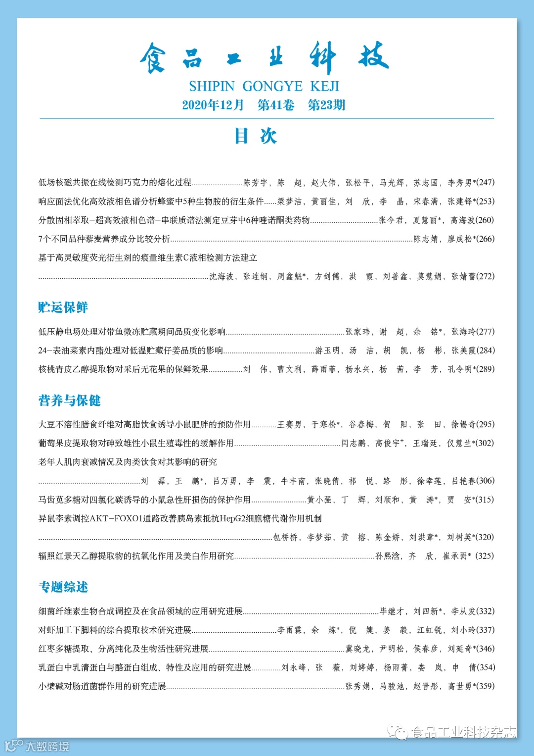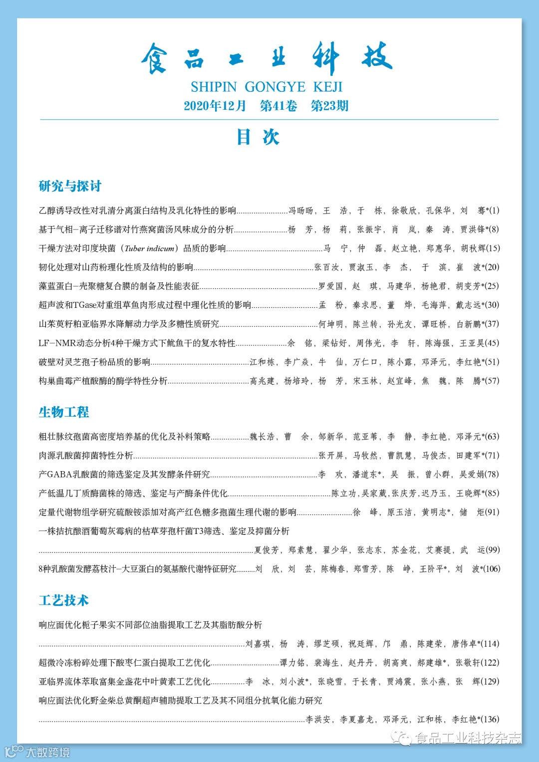 2020年41卷第23期封面及目次 食品工业科技编辑部