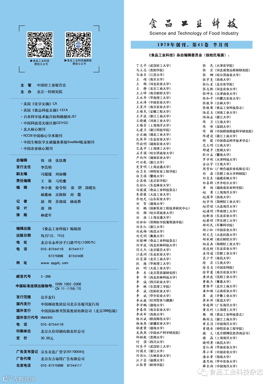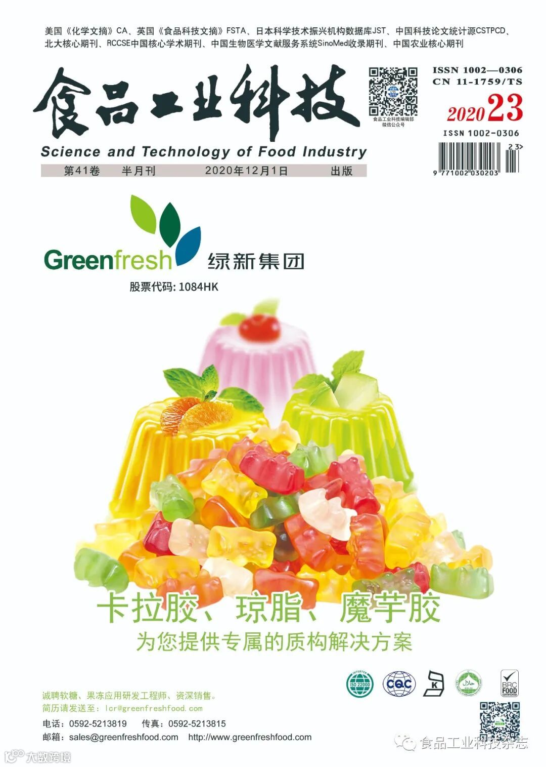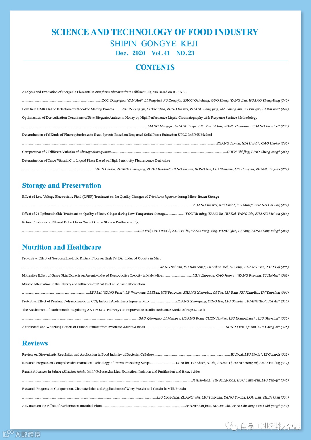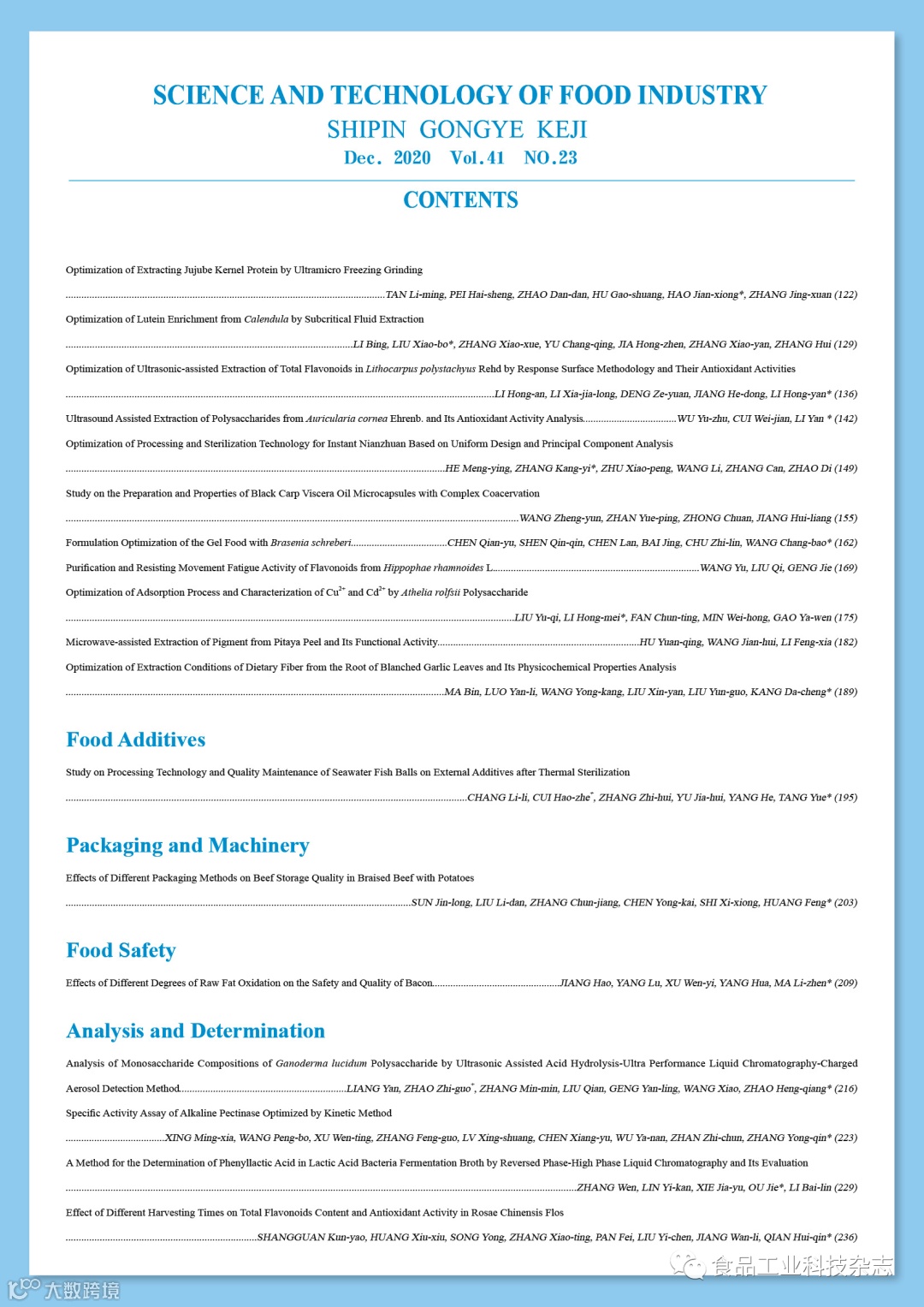 2020年41卷第23期封面及目次 食品工业科技编辑部