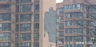 外墙脱落在居住小区也比较常见,多存在于前些年采用聚苯颗粒做为保温材料粉刷至外墙的施工做法,近年各个地方相继推出用保温板材代替保温砂浆的做法后有一定的改善。
