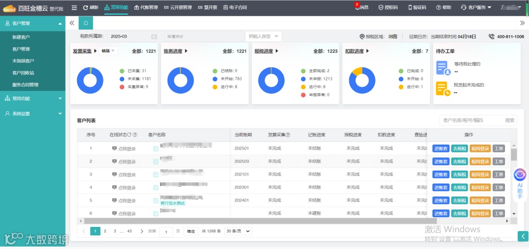 ②账务进度:图表联动【账务进度】模块,按“已结账/未开始/进行中”状态分类展示客户数。