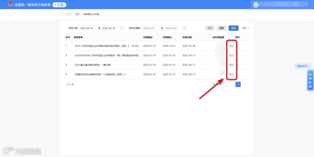 进入【申报更正与作废】界面后,选择申报日期范围、税款所属期等筛选条件,点击【查询】查询已完成申报的申报表信息,从查询结果列表中,点击【更正】,跳转相应模块进行操作,更正成功后会弹出相应提示。