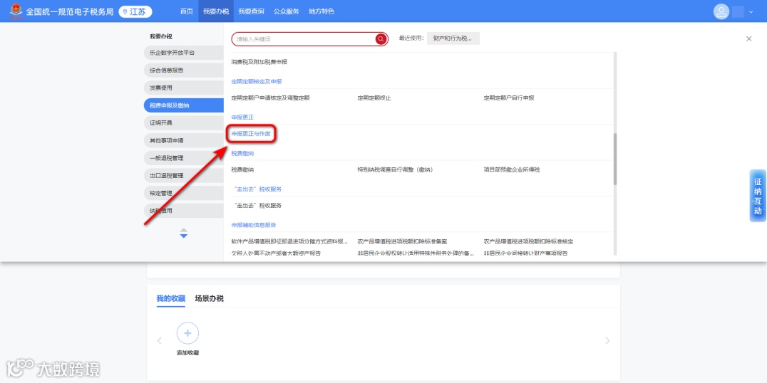 登录电子税务局后,点击【我要办税】-【税费申报及缴纳】-【申报更正与作废】功能菜单。