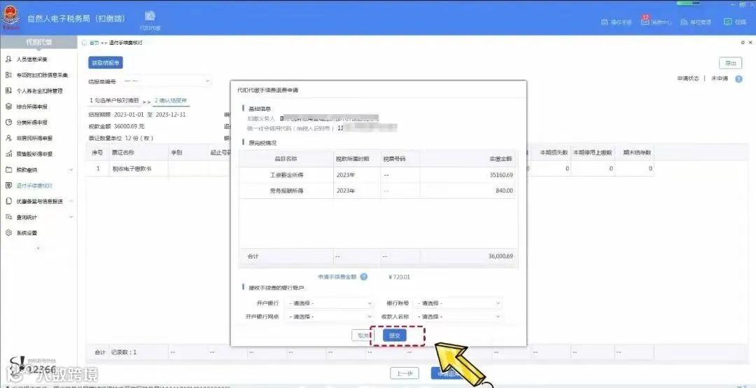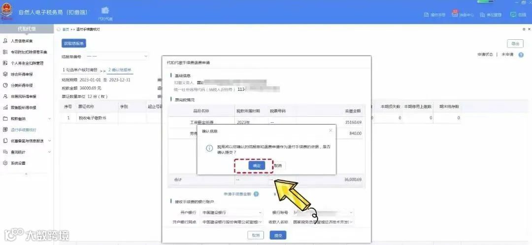 系统弹出“代扣代缴手续费退费申请”,查看申请手续费金额,选择“开户银行”“银行账号”,点击【提交】。提示信息“确认成功”弹框,点击【确定】。完成后系统将推送至税务机关及国库审核,审核通过后,申请的手续费将退到扣缴义务人办理退付手续费时选择的银行账户内。