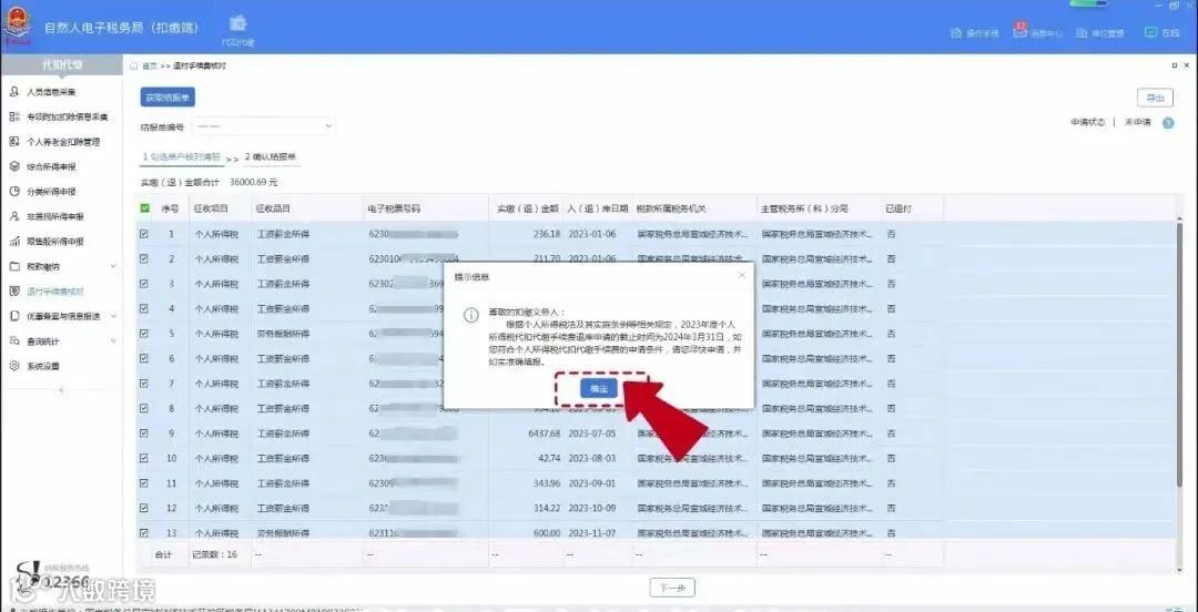 进入“退付手续费核对”界面,系统自动弹出“确认信息”提示框,点击【确定】,系统自动带出单户核对清册。