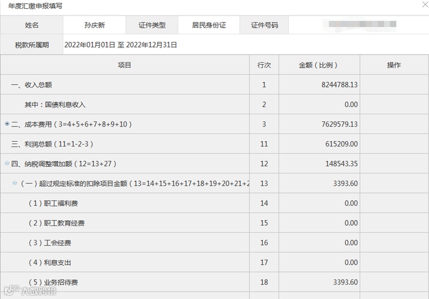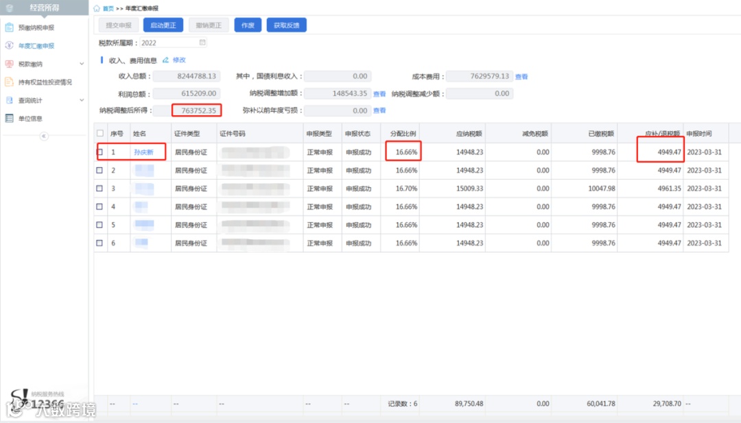 应交个人所得税=763752.35*16.66%*20%-10500-9998.76=4949.47