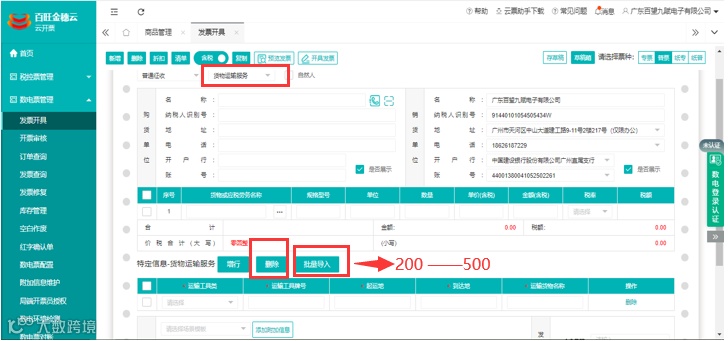 1.数电票开具:旅客、货物运输服务可支持批量删除特定信息,以及每次导入特定信息条数限制不超过500条。
