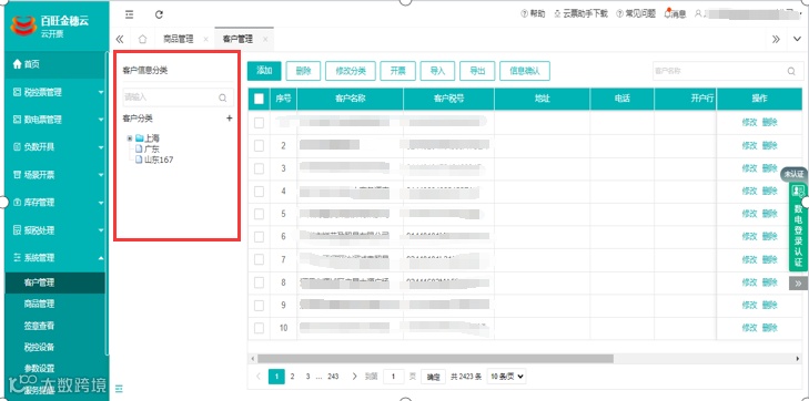 3.客户管理:可支持设置自定义分类、支持维护多地址电话及银行账号。