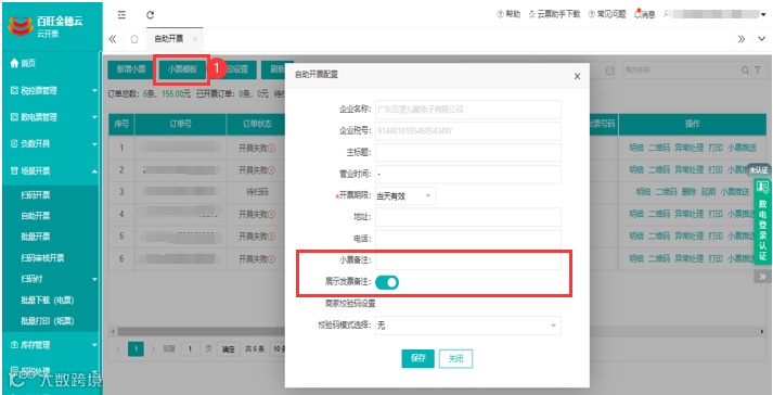 5.自助开票:小票模版支持设置备注是否展示,开启展示备注栏,反之不展示。
