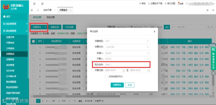 6.发票查询:发票导出/主表信息导出支持按购方名称导出以及导出内容增加收款、复核人字段。