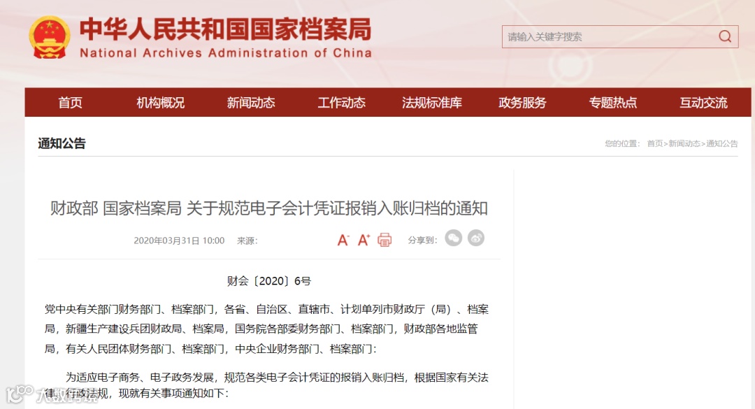 2020年3月,财政部和国家档案局发布《财政部国家档案局关于规范电子会计凭证报销入账归档的通知》,要求规范电子凭证报销等,同时财政部开展了行程单入账凭证电子化试点工作。
