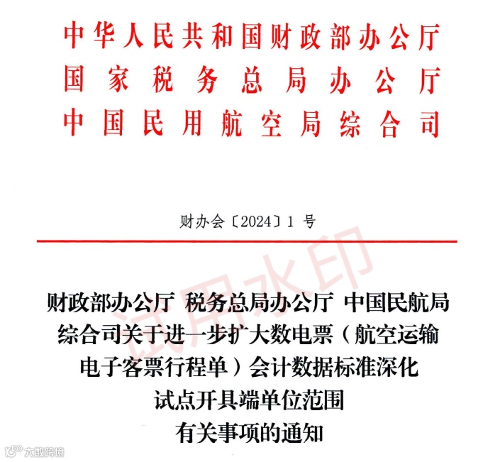 2024年1月,财政部办公厅印发《关于进一步扩大数电票(航空运输电子客票行程单)会计数据标准深化试点开具端单位范围有关事项的通知》,开具端航空运输电子客票行程单扩大到39家航司,165家代理。