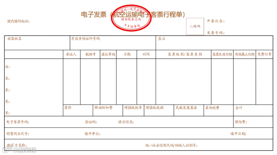 电子行程单:右上角增加了开票状态、发票号码、二维码信息;中间区域增加了增值税税率、增值税税额信息;最下方增加了购方名称、统一社会信用代码/纳税人识别号信息。