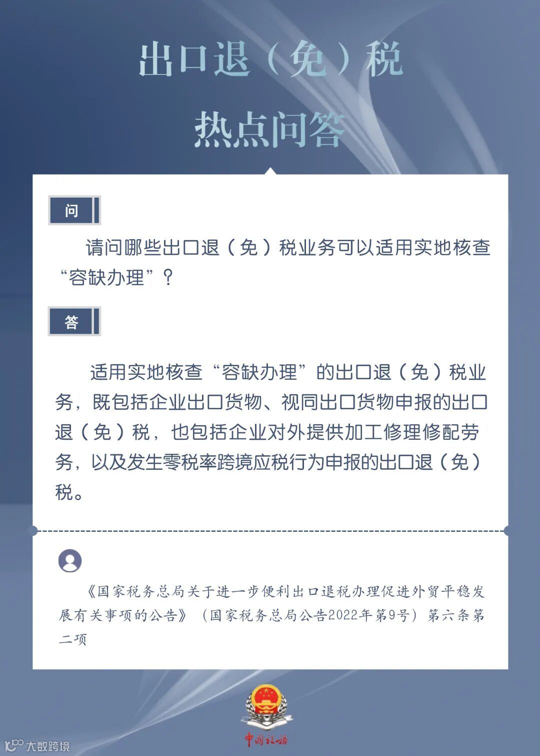为进一步加力支持包括中小微企业在内的广大经营主体开展外贸出口业务,便于企业掌握出口退税现行规定、及时了解出口退税便利化举措,商务部、国家税务总局针对企业普遍关心的出口退税热点问题,整理了问答集锦。我们将陆续发布热点问答相关内容,今天发布:请问哪些出口退(免)税业务可以适用实地核查“容缺办理”?