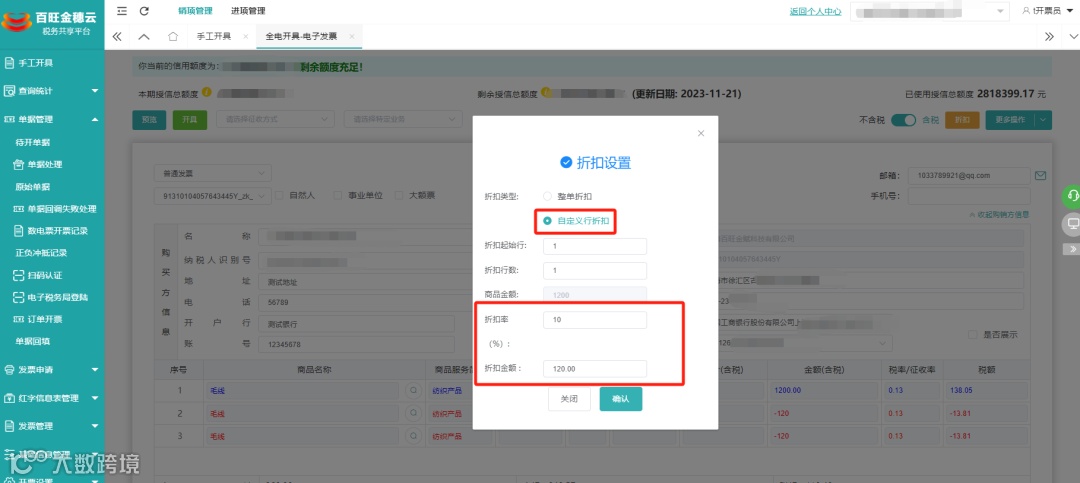 按金额、比例进行自定义行折扣,并自动计算折扣金额。