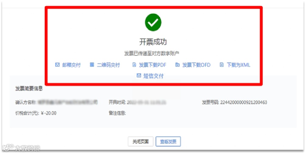 电子发票开具后,支持:邮箱交付、二维码交付、PDF交付、OFD交付、XML交付、短信交付、重发(二次推送)。
