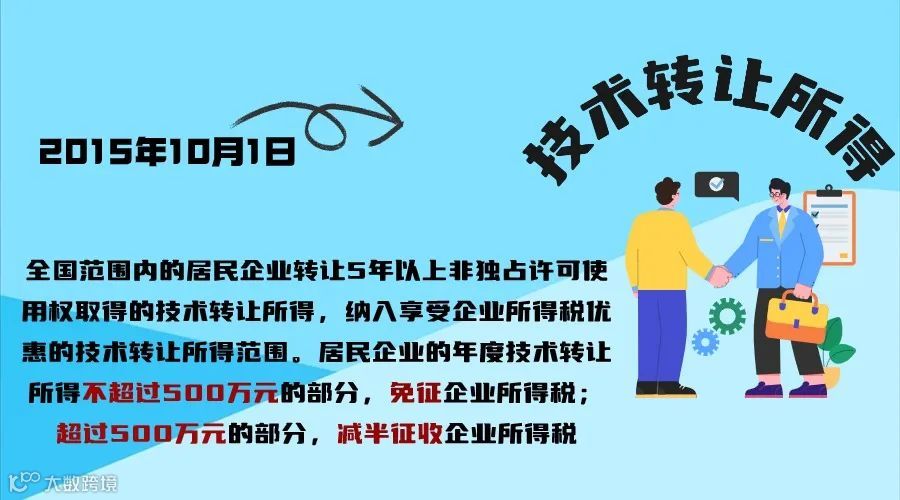 自2015年10月1日起,全国范围内的居民企业转让5年以上非独占许可使用权取得的技术转让所得,纳入享受企业所得税优惠的技术转让所得范围。居民企业的年度技术转让所得不超过500万元的部分,免征企业所得税;超过500万元的部分,减半征收企业所得税。