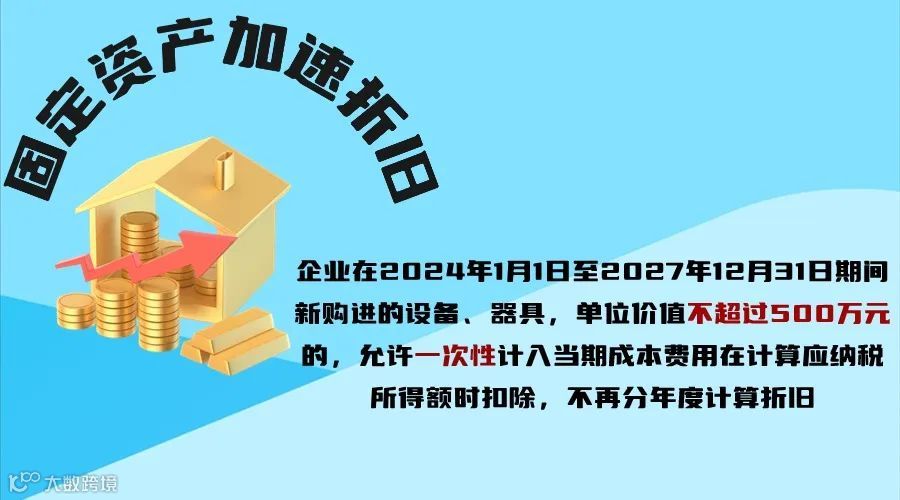 企业在2024年1月1日至2027年12月31日期间新购进的设备、器具,单位价值不超过500万元的,允许一次性计入当期成本费用在计算应纳税所得额时扣除,不再分年度计算折旧;单位价值超过500万元的,仍按企业所得税法实施条例、《财政部 国家税务总局关于完善固定资产加速折旧企业所得税政策的通知》(财税〔2014〕75号)、《财政部 国家税务总局关于进一步完善固定资产加速折旧企业所得税政策的通知》(财税〔2015〕106号)等相关规定执行。