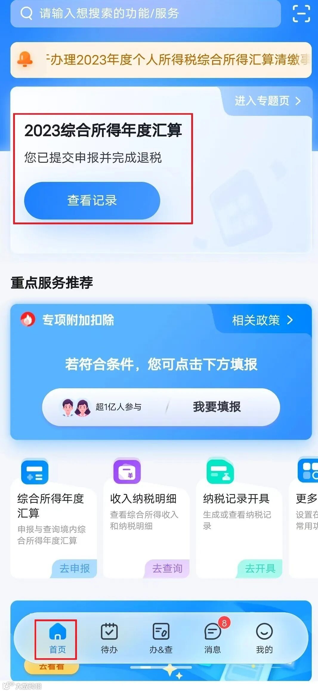 1.登录“个人所得税”APP,点【首页】即可看到“2023综合所得年度汇算”专题,点击【查看记录】。