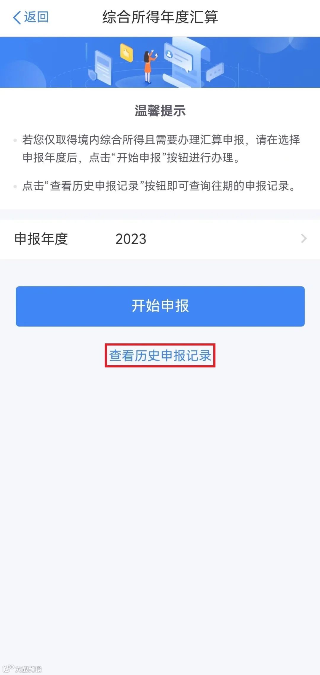 1. 登录“个人所得税”APP,在【首页】的【重点服务推荐】模块依次选择【综合所得年度汇算】-【查看历史申报记录】。