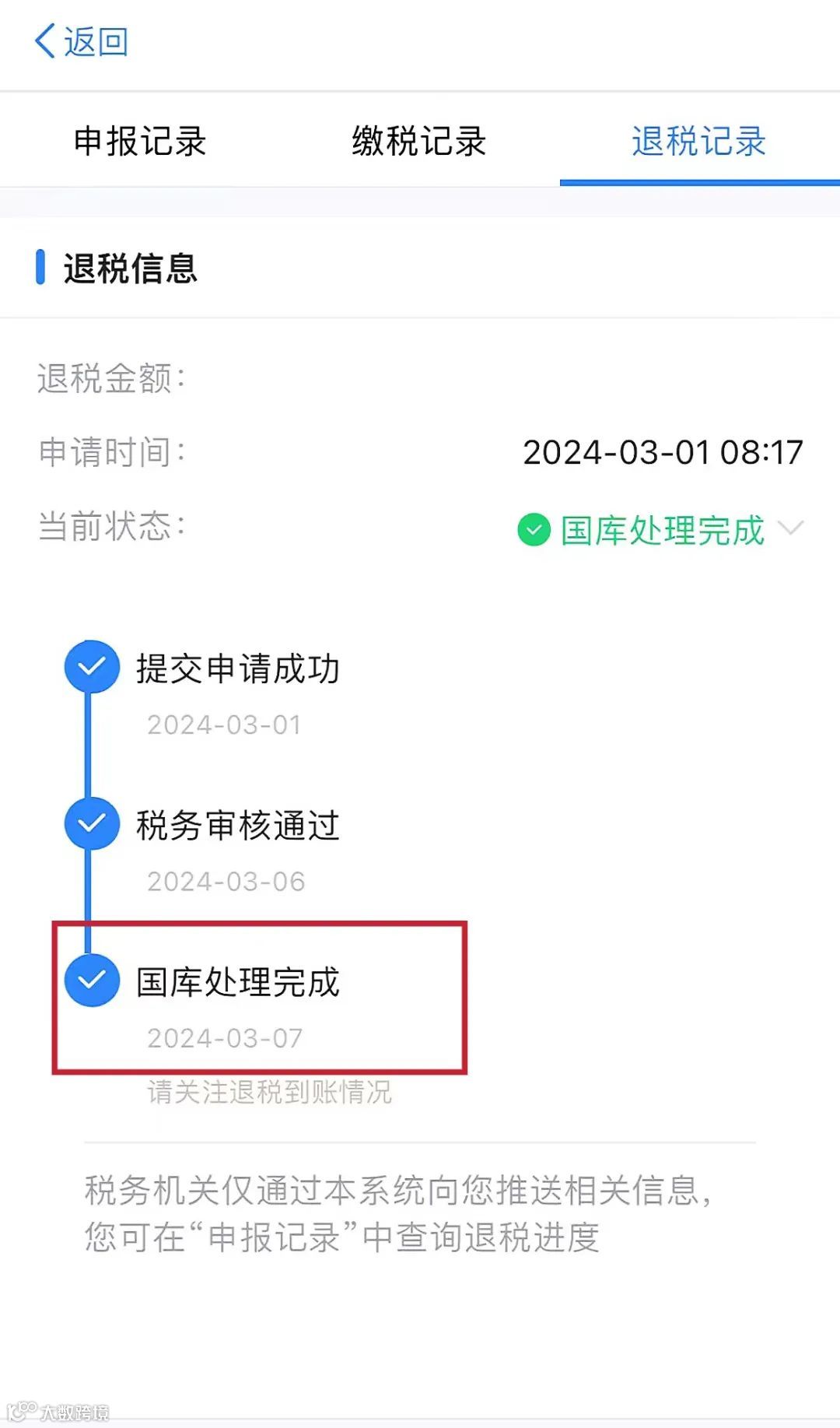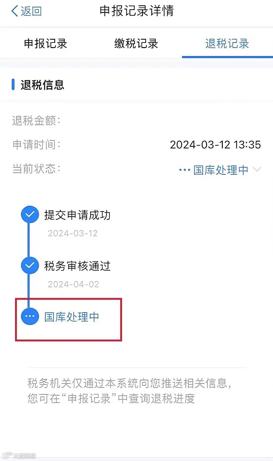 “国库处理中”表示税务机关已审核通过,并将您的退税申请提交国库,国库正在按规定处理中。处理完成后,税款将退至您填写的银行账户。