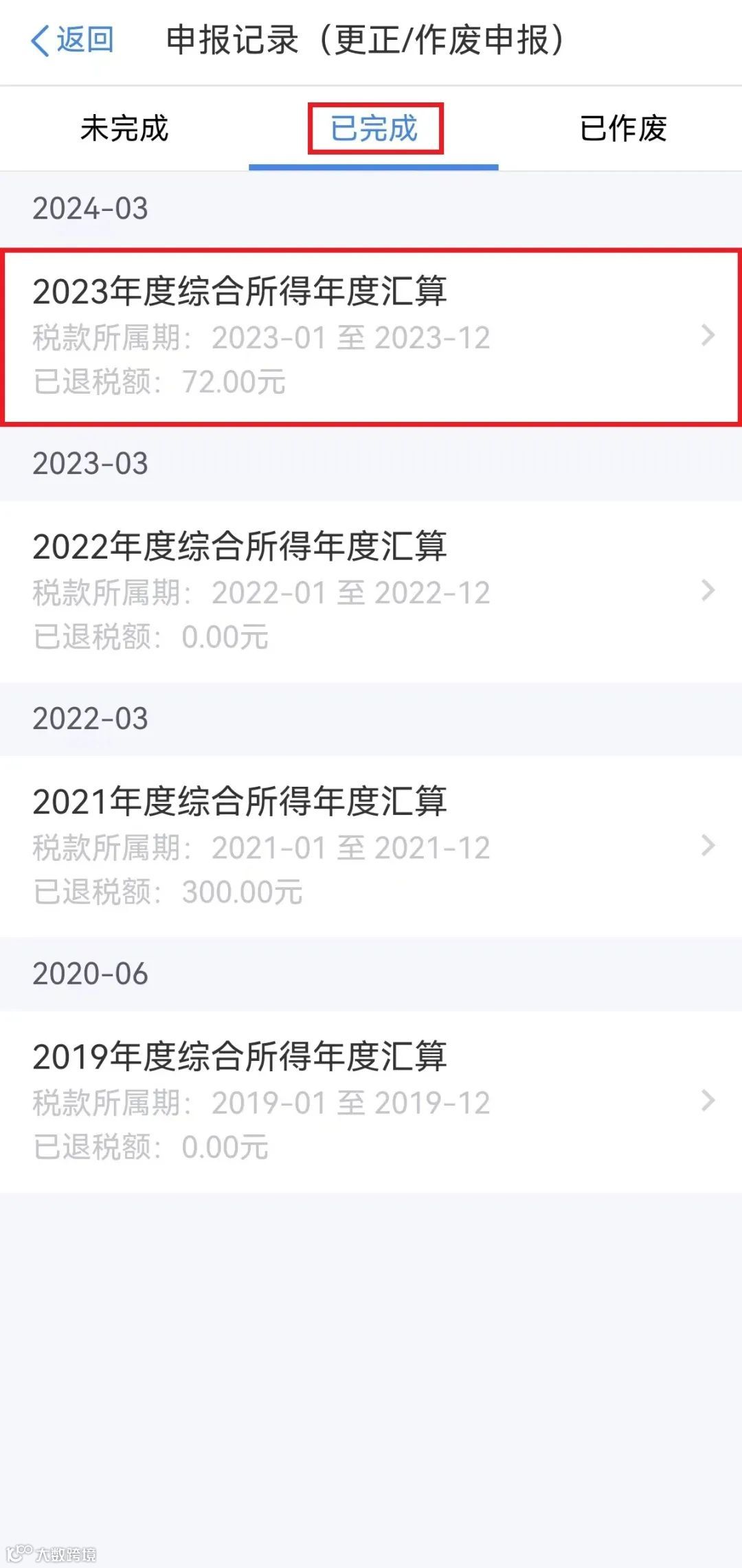 2.在“申报记录(更正/作废申报)”页面点击【已完成】后选择【2023年度综合所得年度汇算】。在“申报记录详情”页面依次点击【退税记录】- 【当前状态】右侧下拉键,即可查看退税进度。