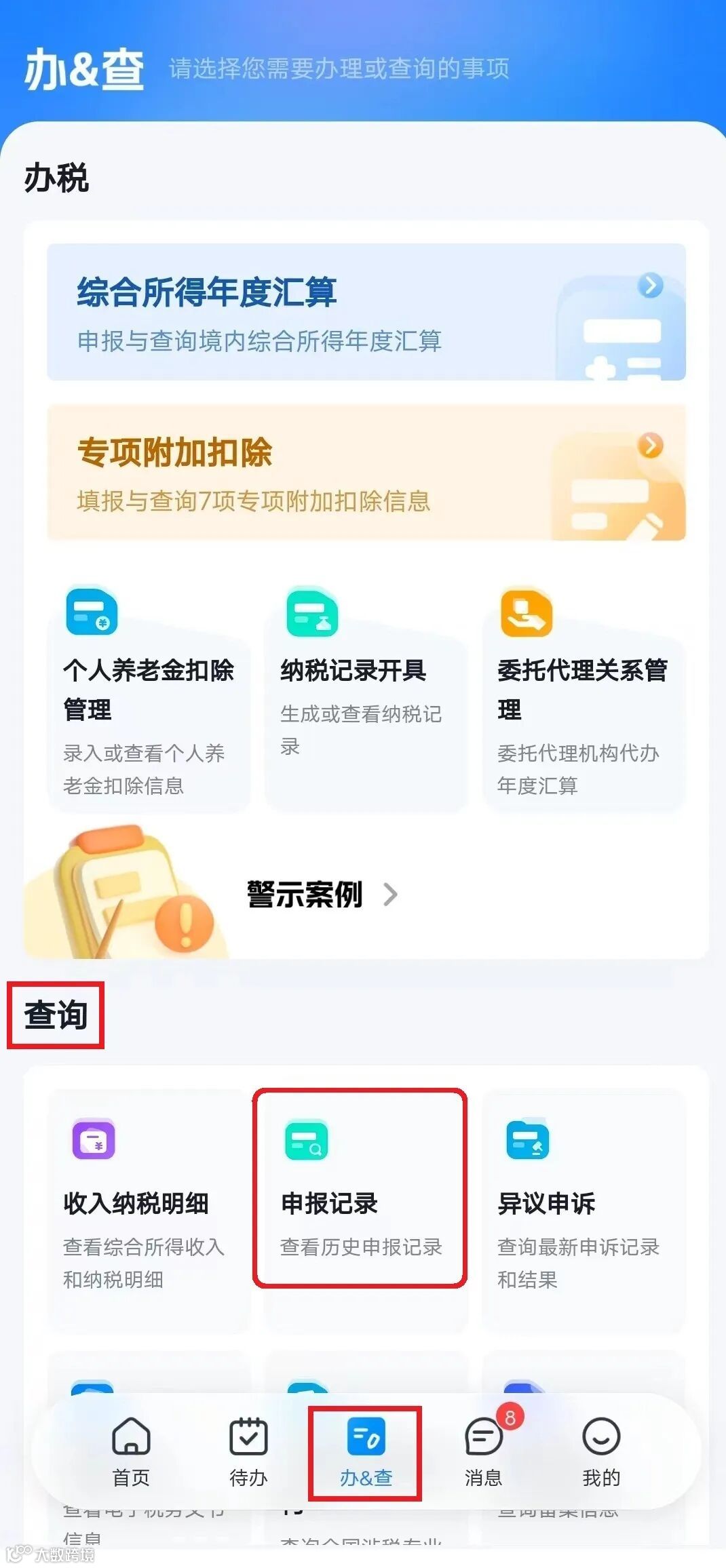1.登录“个人所得税”APP,依次点击【办&查】-【查询】-【申报记录】。