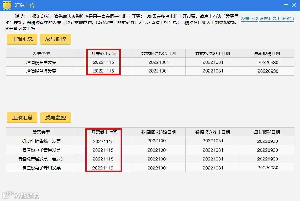 操作流程:重新打开汇总上传界面,查看各发票类型开票截止时间是否更新到下月中旬,若更新,说明操作成功。