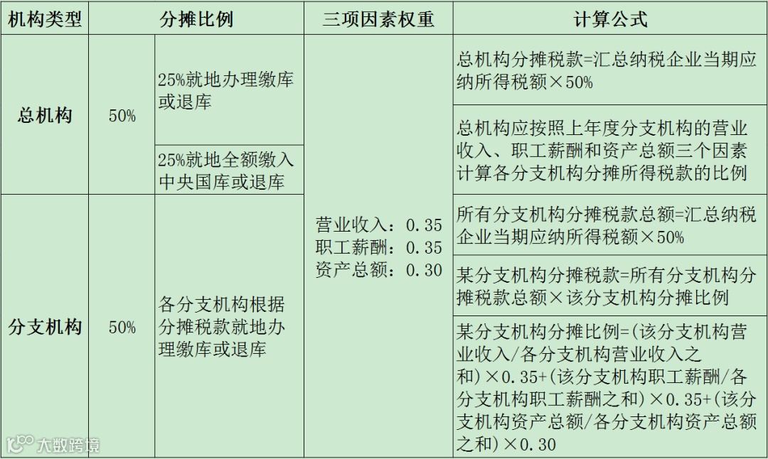 即先由总公司按照总公司税率统计计算应纳税所得额,然后总公司按照50%分摊税额,剩余50%由分支机构分摊,如设立多个分支机构,各个分支机构再按照特定的比例分摊。分摊比例如下: