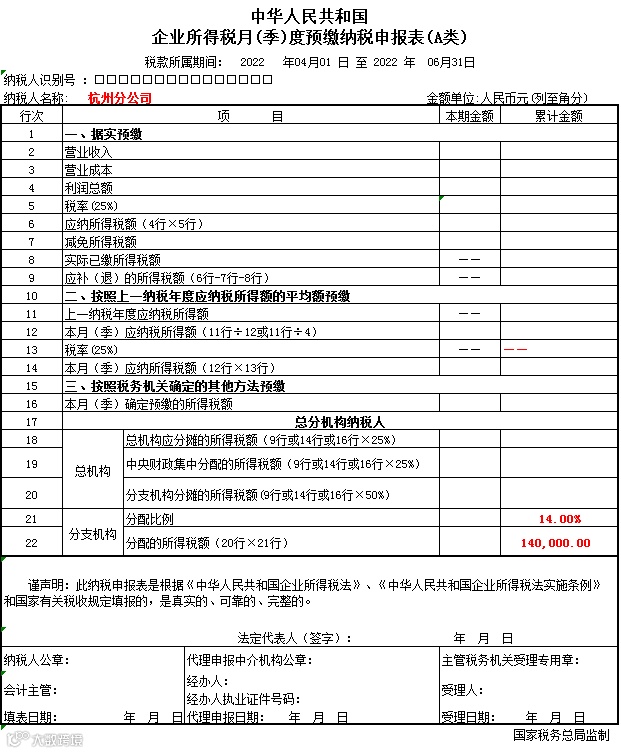 分公司企业所得税月(季)度预缴申报表