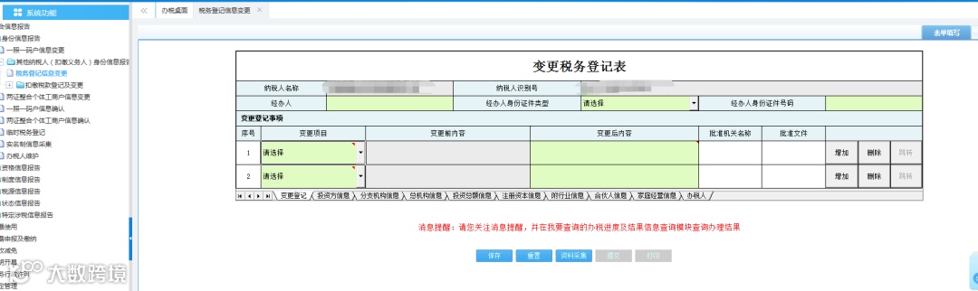 模块路径:我要办税--综合信息报告--身份信息报告--税务登记信息变更