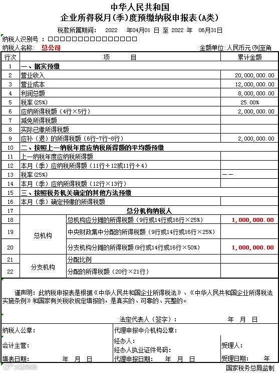 2、分公司季度申报企业所得税时也是按照收入、成本费用、实际利润计算填报吗?