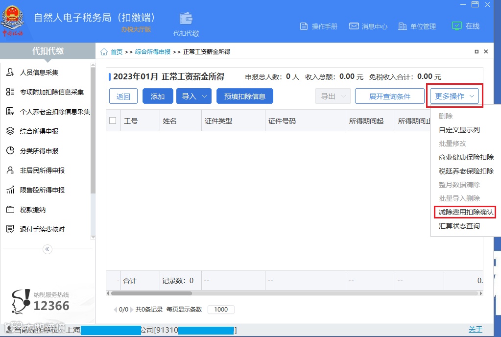 若以上提示未自动弹出或人员名单需要调整,您也可直接通过【综合所得申报】-【正常工资薪金所得】-【更多操作】-【减除费用扣除确认】进入操作。