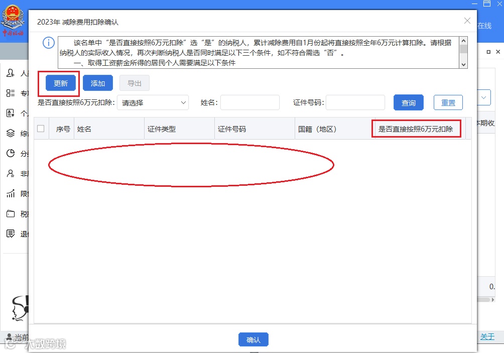 如果重装了扣缴端或通过其他渠道变更了需要按照6万元扣除减除费用的纳税人信息,可点击【更新】按钮从服务端获取最新的确认结果。