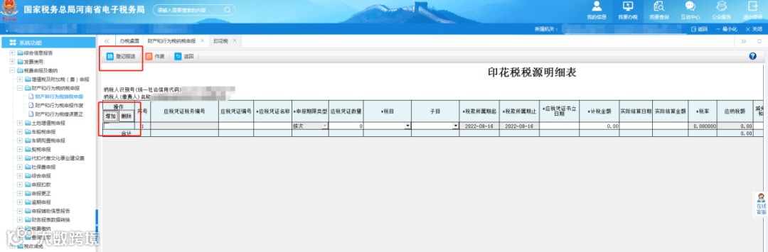 以国家税务总局河南省电子税务局为例,登录电子税务局,在我要办税-税费申报及缴纳模块,找到财产和行为税纳税申报,首先新增申报,要进行税源信息采集(如图三所示),税源信息采集-新增税源信息采集(如图四所示),根据税费种认定信息和实际业务,选择按照季度申报还是次报(如图四所示),选择信息之后,就到了填写申报信息的界面了,需要新增行次,根据实际发生业务,填列相应的税目和时间金额等信息(如图五所示),登记报送,然后申报就可以啦~